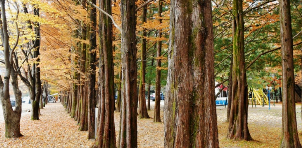 우리가 보통 생각하는 ‘도로형 가로수길’이라기보다는 캠핑장 부지 또는 인근 산책 코스를 따라 걸을 수 있는 짧은 구간의 산책로 형태인거죠. 길이 역시 200~300m 내외로 비교적 짧은 편인데 메타세콰이어 특유의 곧게 뻗어 자란 나무들이 일정 간격으로 식재되어 있는 것은 전국 어디서나 볼 수 있는 공통적 모습이죠.