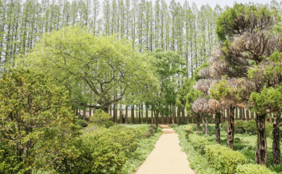 아가페정원에는 메타세쿼이아 나무 외에도 향나무, 소나무, 오엽송, 공작단풍 등 17종 수목이 함께 식재되어 계절마다 제각각 다른 분위기를 선사합니다. 이 곳은 영국식 포멀가든 양식을 따라 조성했답니다. 정원 전체가 대칭적이고 기하학적 구조로 조성해 두어 메타세콰이어길이 더욱 도드라지는 특징이 있다고 합니다.