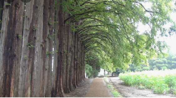 영덕 벌영리 메타세콰이어길처럼 익산 아가페정원도 개인이 조성한 정원입니다. 이 아가페정원에 대략 100~150m 길이의 숲 속 산책로를 만들면서 양옆에 메타세콰이어 1,400그루가 줄지어 있답니다. 곧게 뻗어 자라는 것이 메타세콰이어 나무의 특징이지만 여기 메타세콰이어 나무는 높이가 무려 40m에 이르러 제대로 된 숲의 터널을 만들어 내고 있네요.