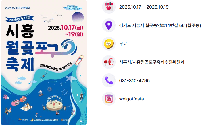 경기도 시흥시 월곶포구 일대에서 열리는 2025년 12회 시흥 월곶포구축제가 10월 17일(금)부터 19일(일)까지 사흘간 개최됩니다. 시흥시민으로서 시흥시의 대표 축제로 자리 잡아가는 시흥 월곶포구축제에 대해 자세히 소개해 드릴까 해요. 특히 올해는 시흥월곶포구축제가 경기대표관광축제로 선정되었다는 반가운 소식까지 전해드립니다.