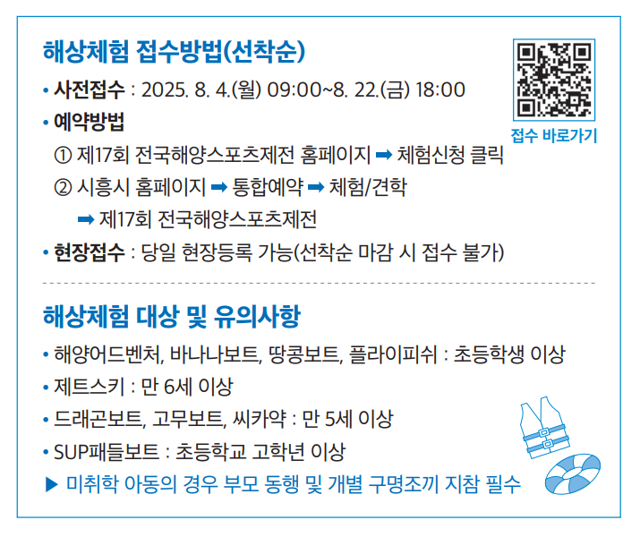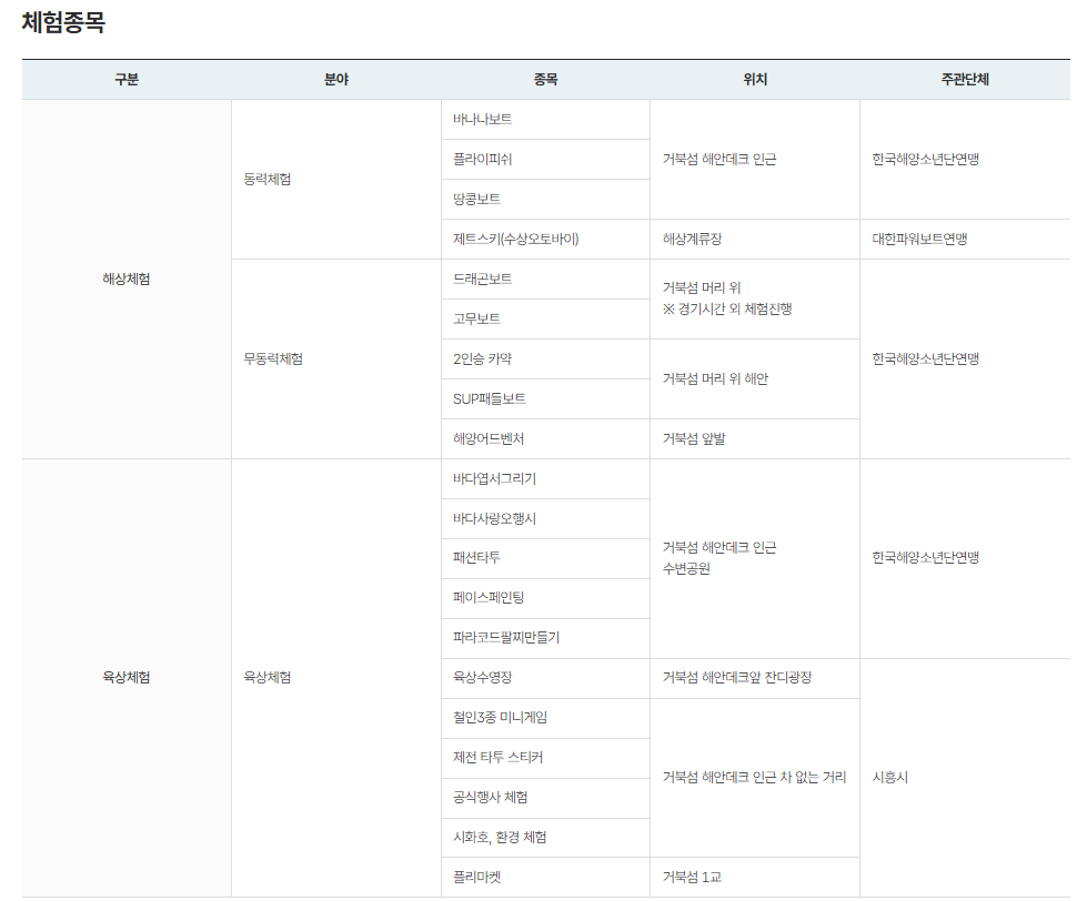 - 예약방법 : ⓛ17회 전국해양스포츠 전 홈페이지 → 체험신청 클릭, ②시흥시 홈페이지 → 통합예약 → 체험/견학 → 17회 전국해양스포츠제전에서 신청